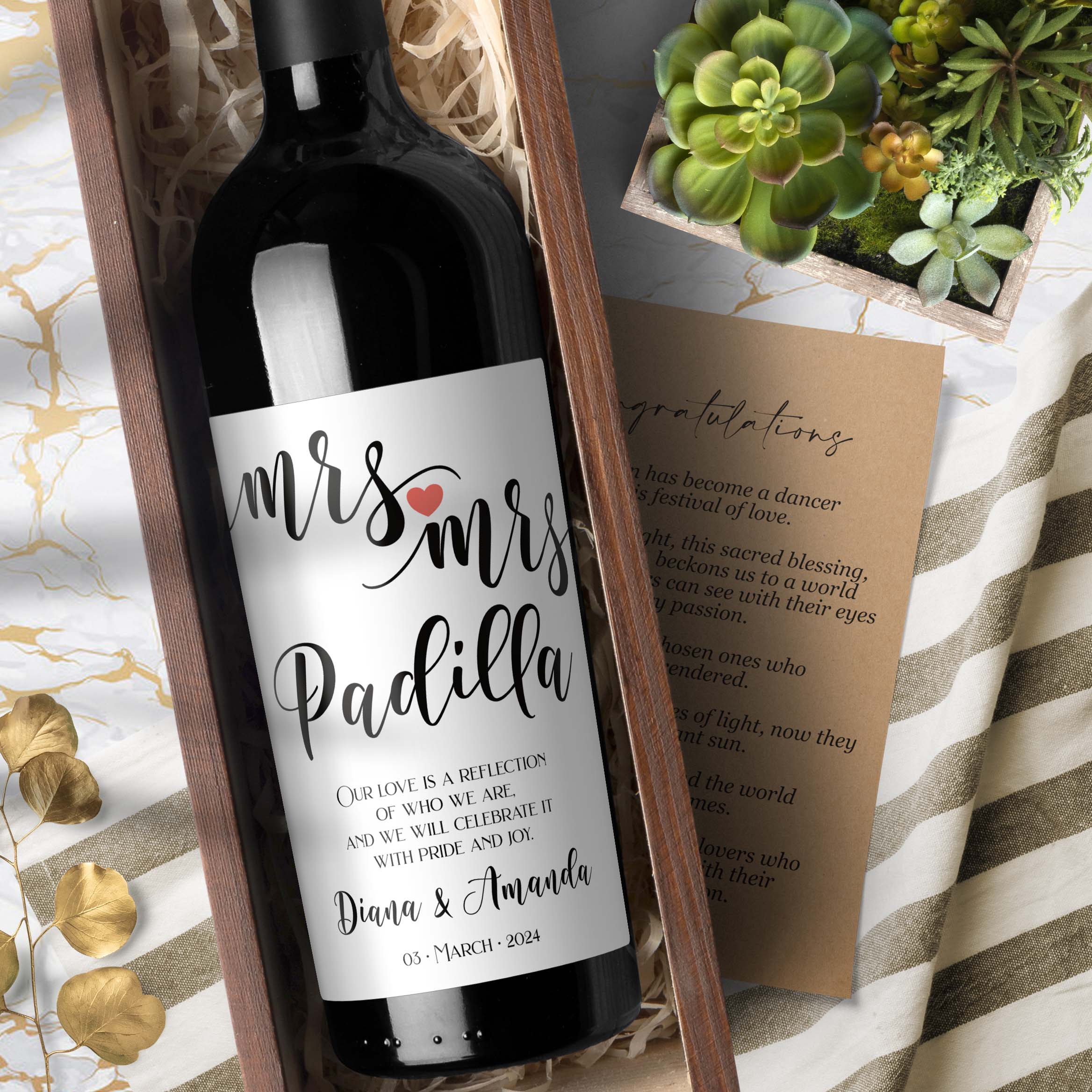 5. Toasting Tags: Finally, you can personalize your wine bottles by adding toasting tags. These are small tags that can be tied around the neck of the bottle and include a special message or quote. For a gay wedding, you could include a message of love and support for the LGBTQ+ community or a quote that represents your love.