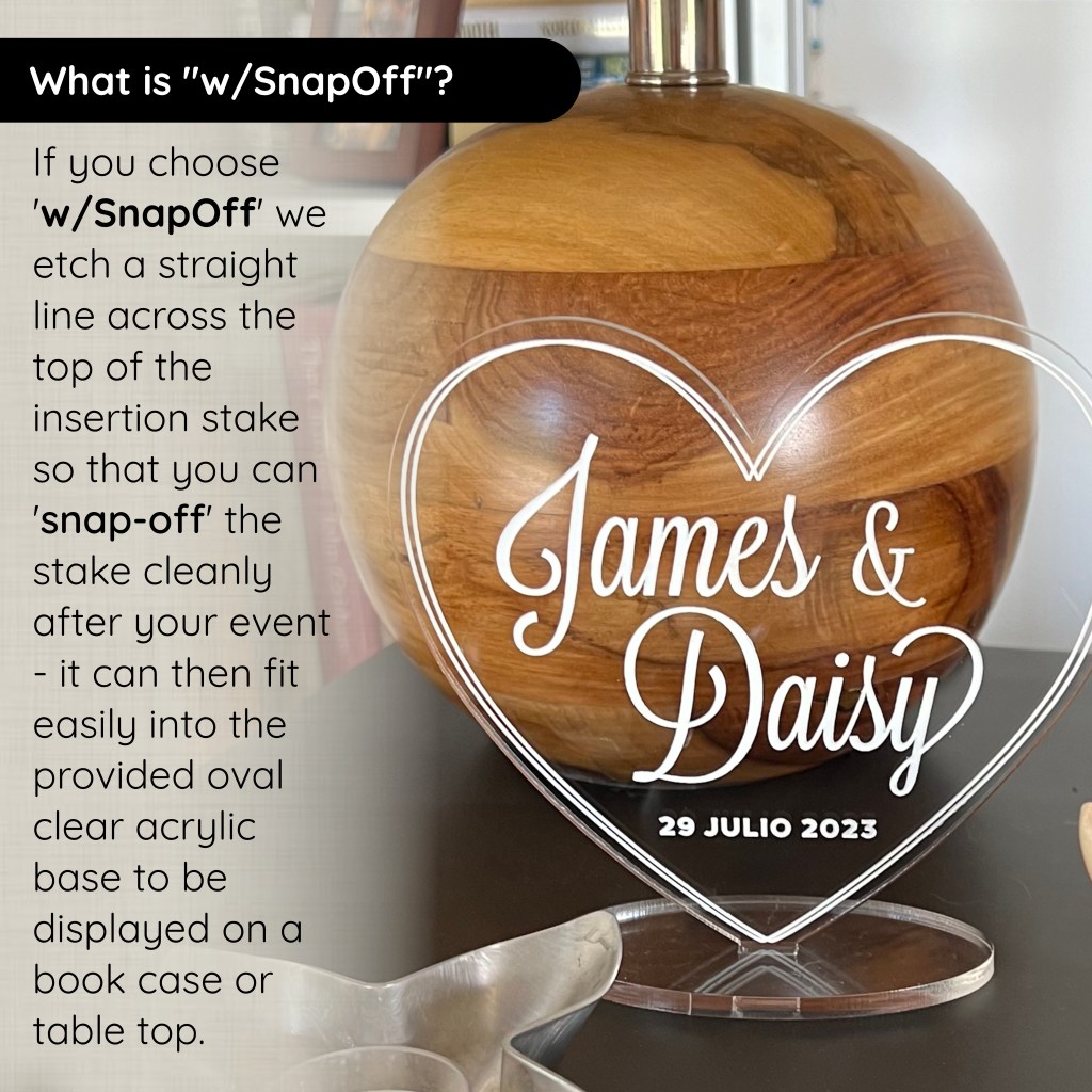 One of the innovative features we offer is the “Snap Off” stake. This stake is designed for easy insertion into the wedding cake, ensuring it stays securely in place during the ceremony and photos. What sets it apart is its clever design that allows for effortless removal after use. Breann was quick to recognize the convenience this feature offered. She chose to add the “Snap Off” stake to her cake topper, and it made all the difference.