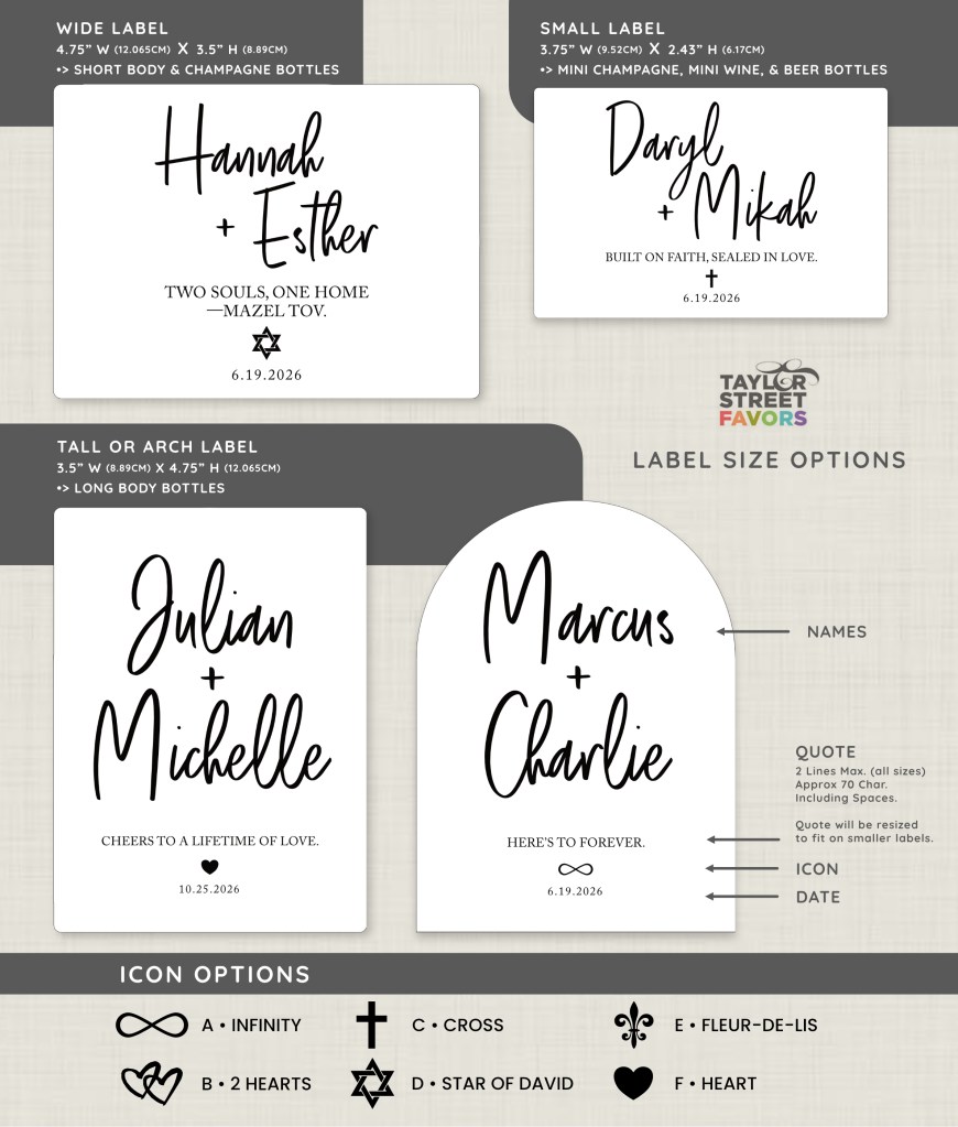 Love is love, and every couple deserves to celebrate their journey. Our designs work beautifully for traditional weddings, LGBTQ+ celebrations, interfaith unions, and everything in between. Whether you’re honoring religious traditions with a cross or Star of David, or keeping it simple with hearts and infinity symbols, we’re here to help you create labels that authentically represent your relationship.