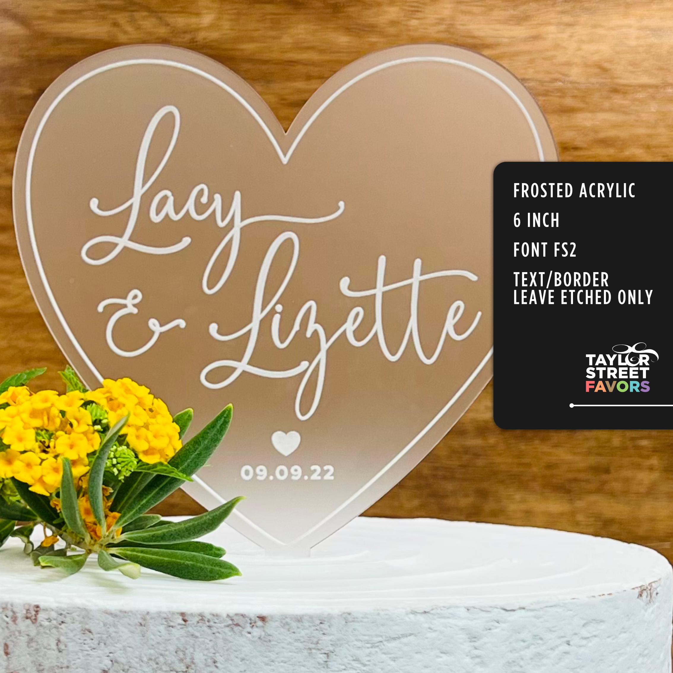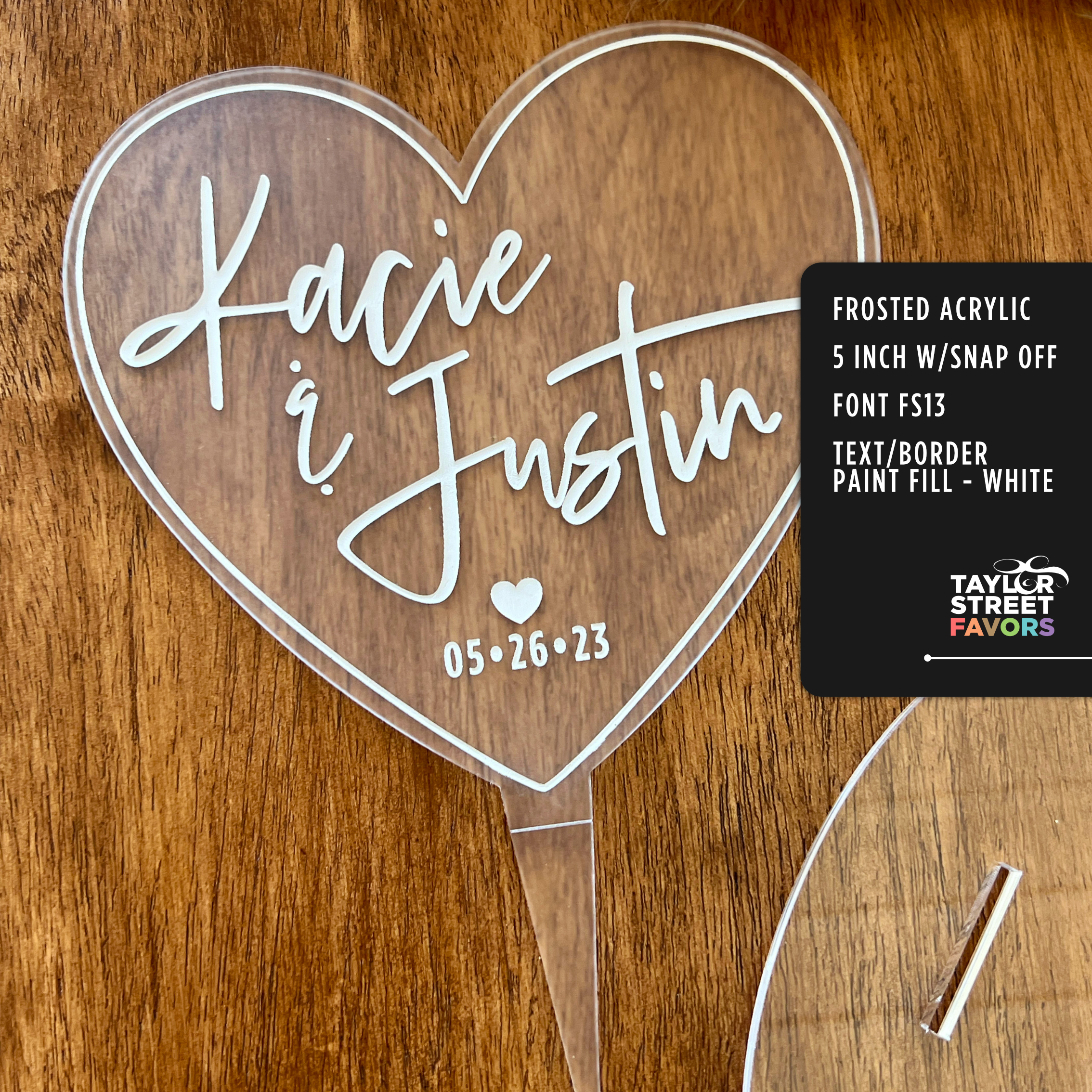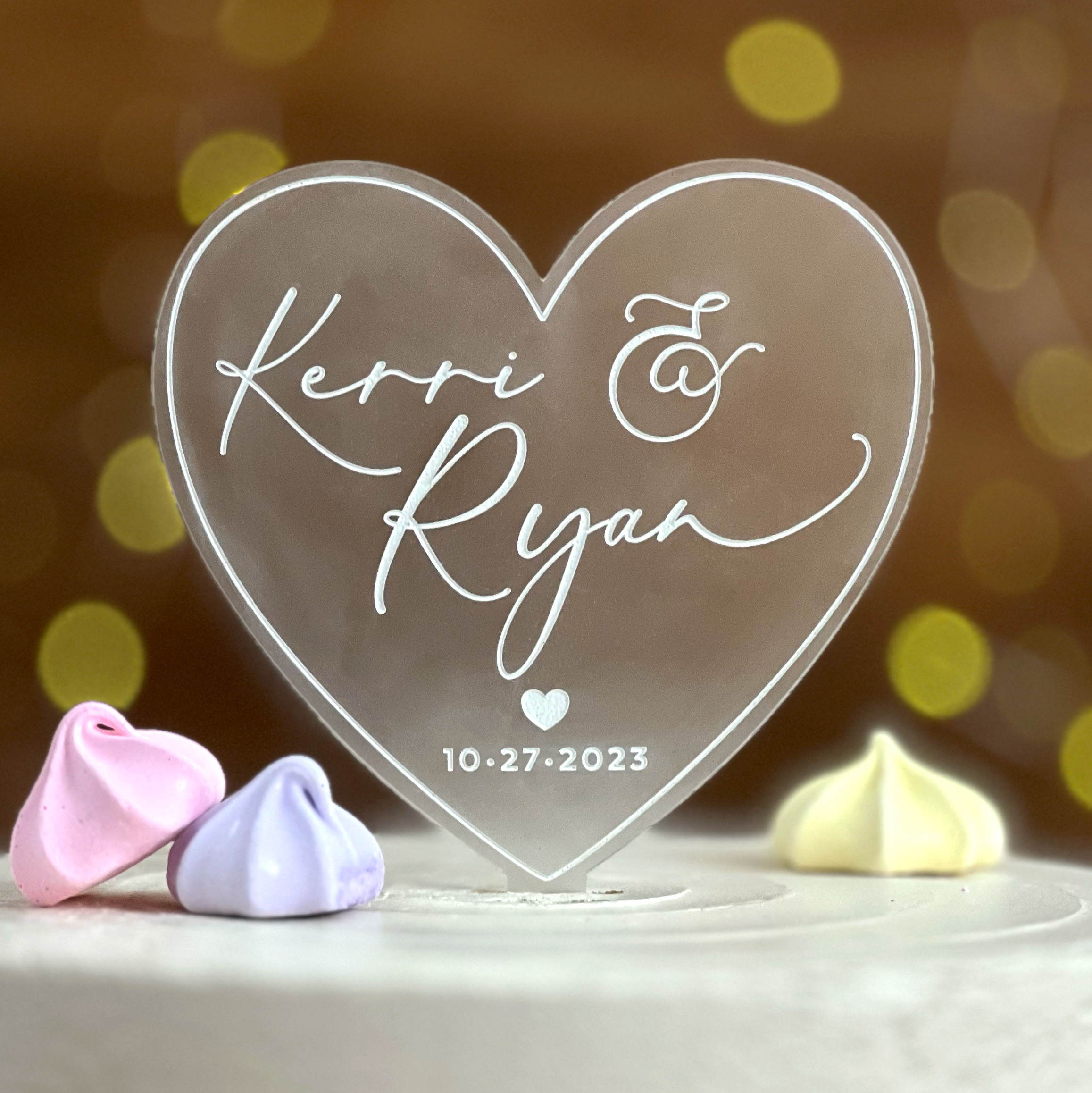 You can shop this Personalized Frosted Acrylic Heart Cake Topper here: