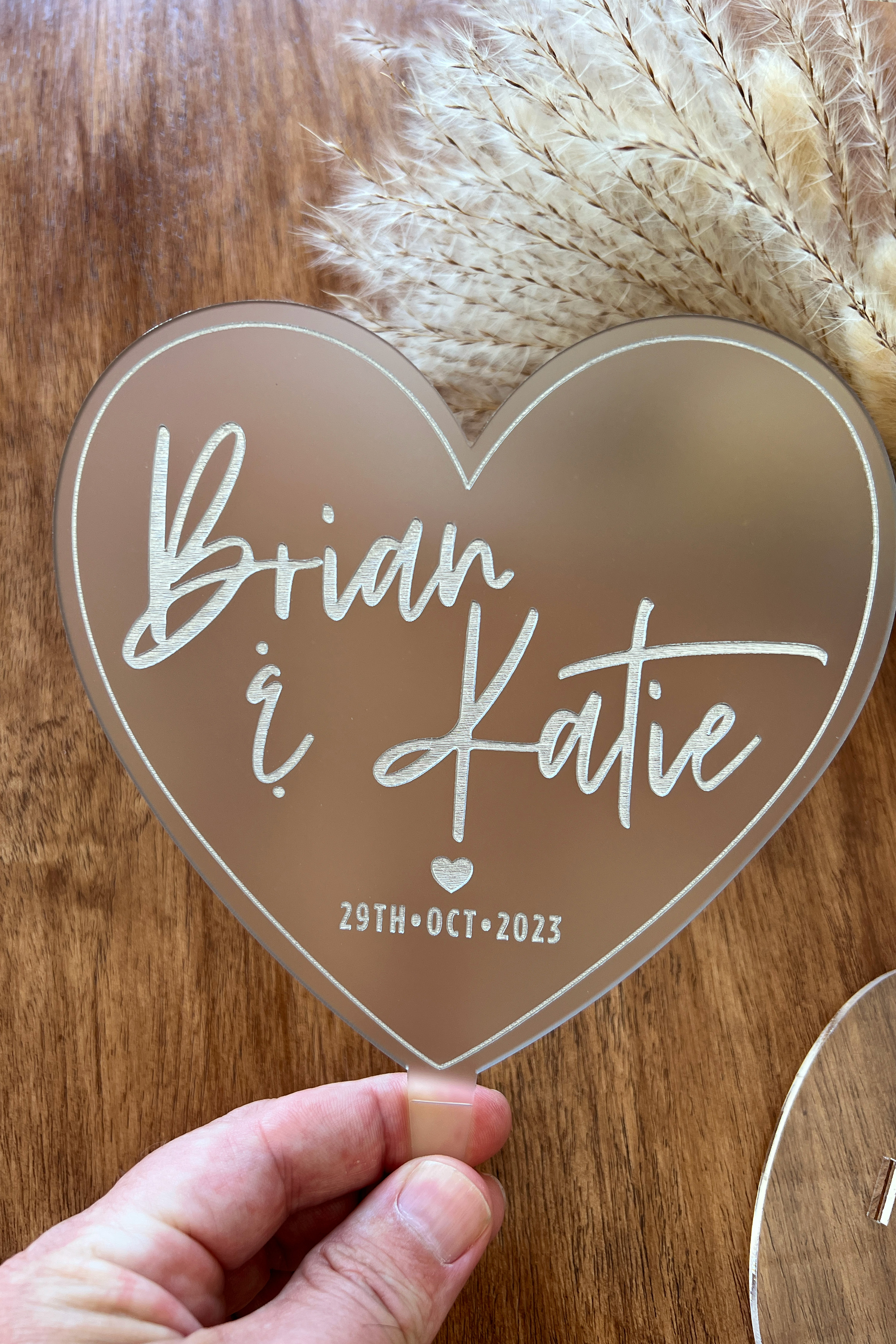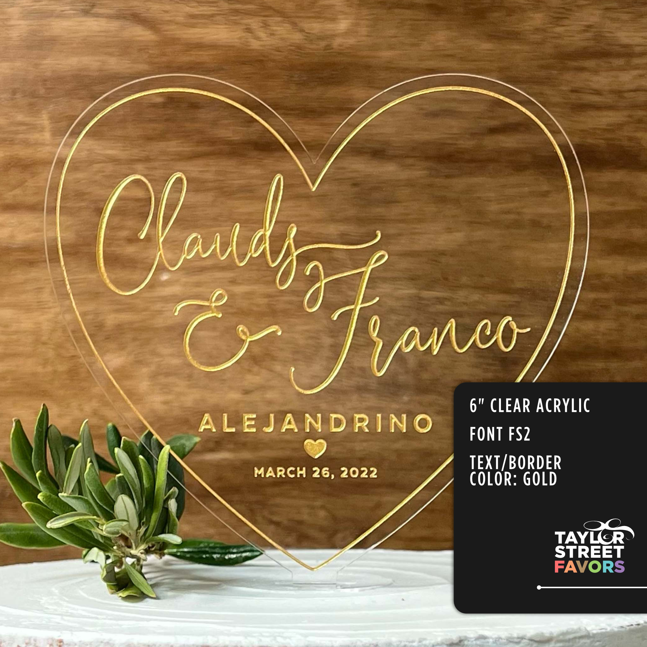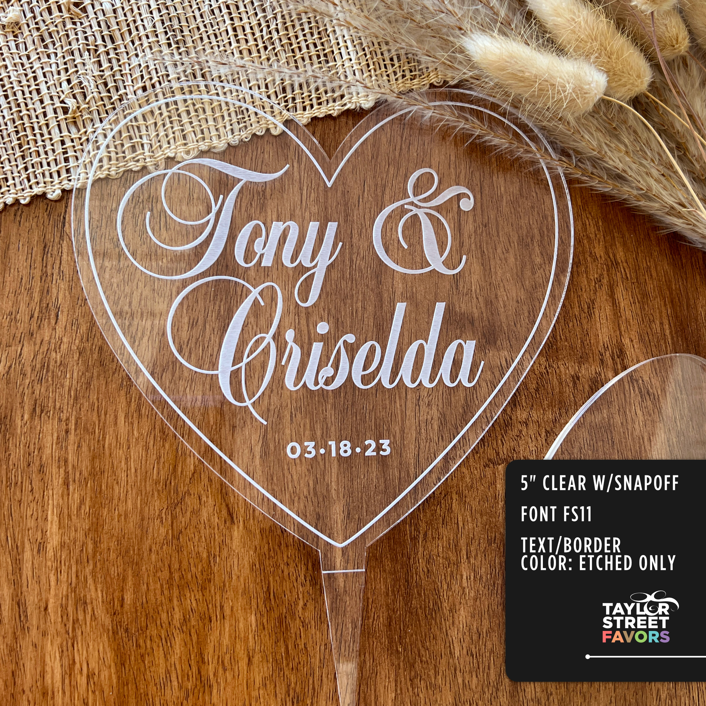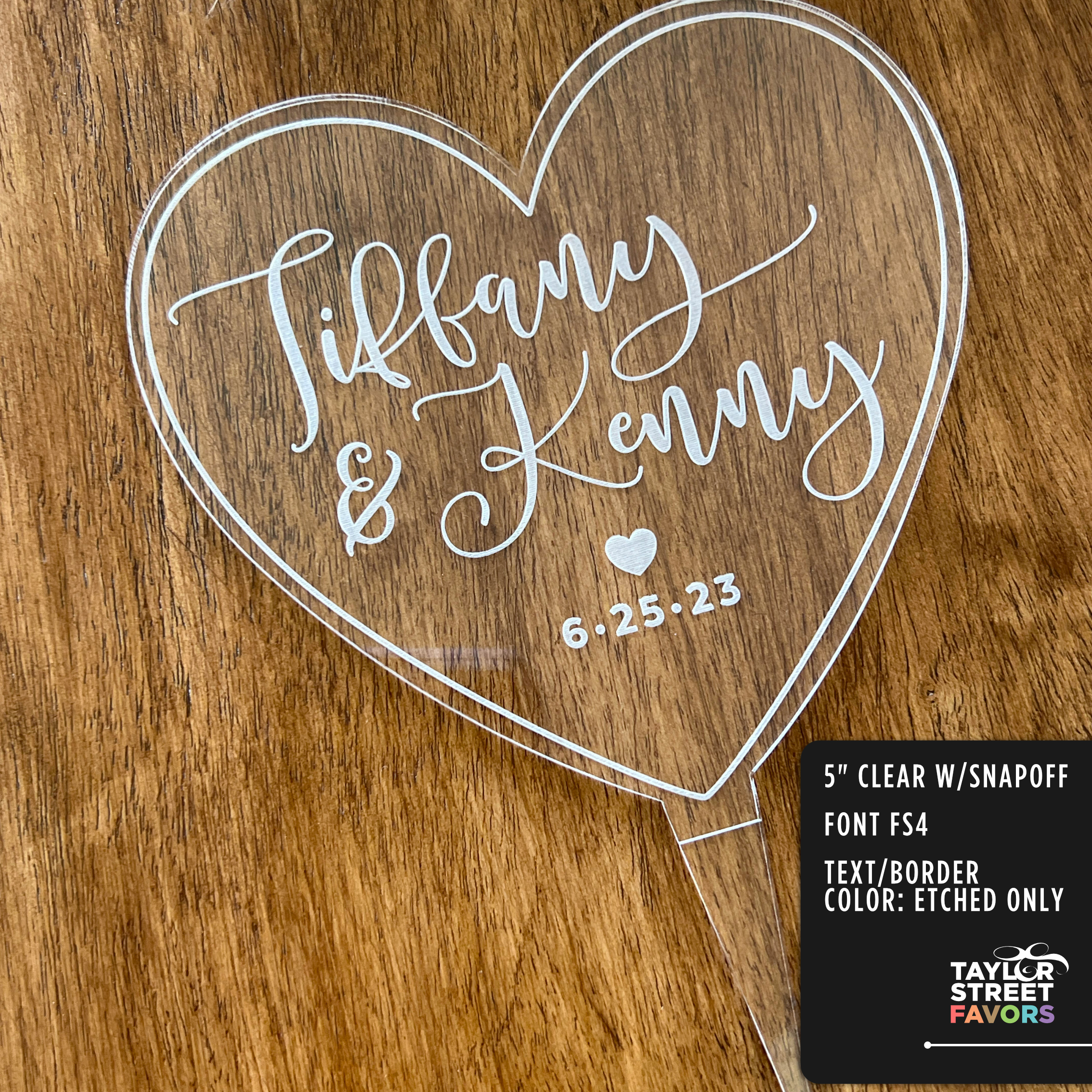 You can shop this Personalized Frosted Acrylic Heart Cake Topper here: