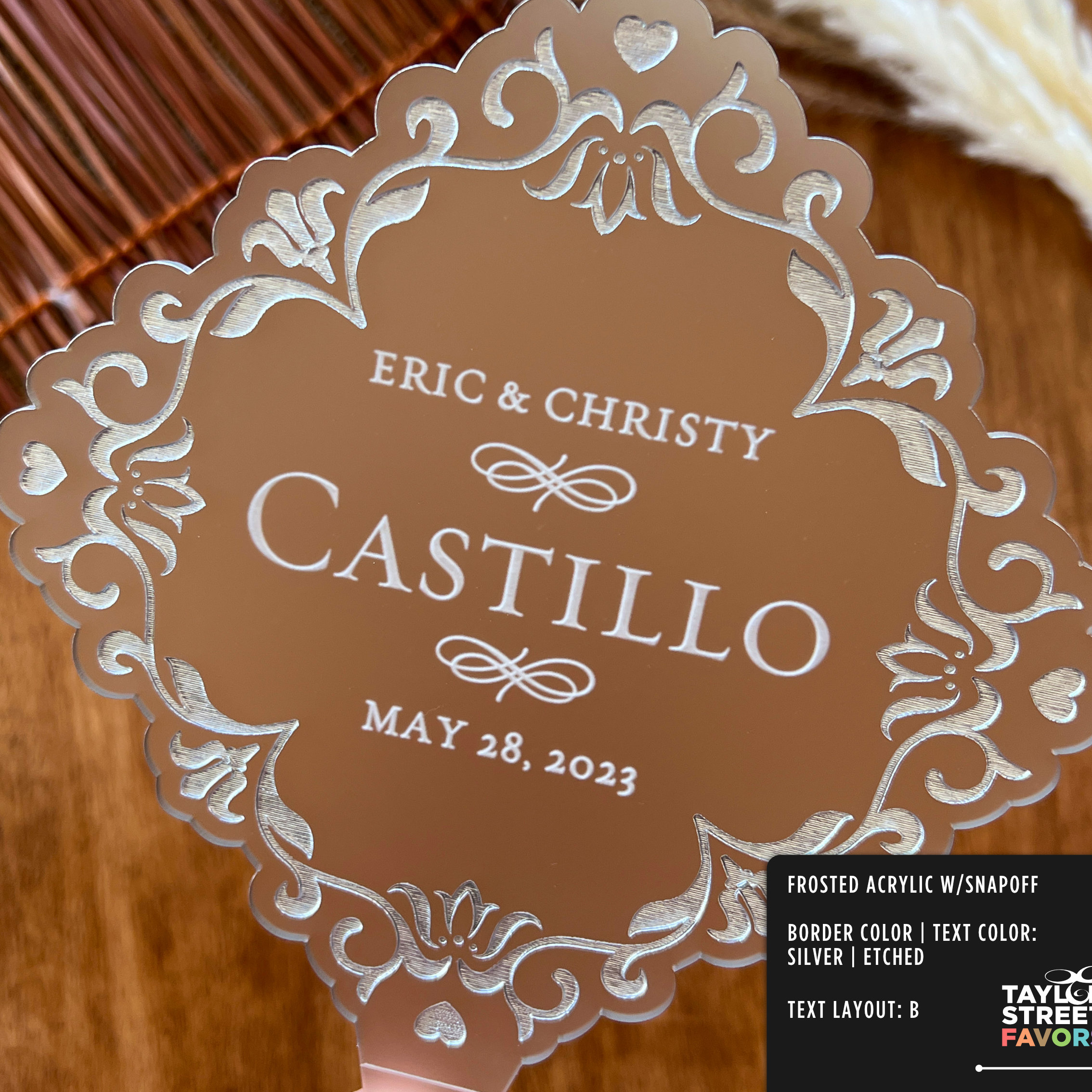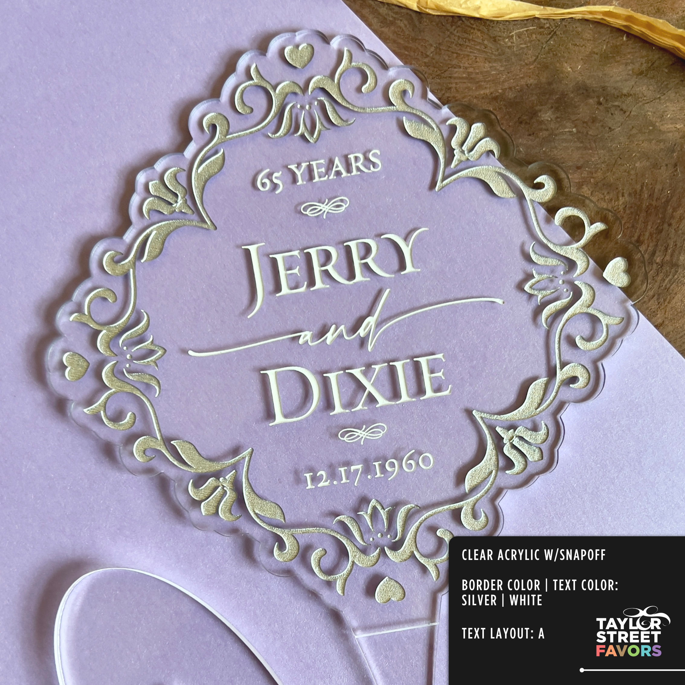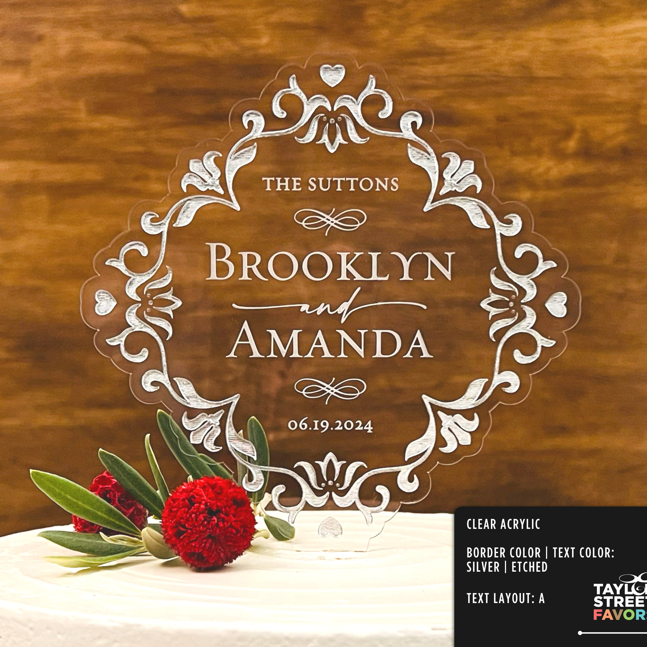 It’s cut from 1/8” thick acrylic, available in clear or frosted, and sized at 6.25” wide by 6” tall with a 2” stake. Enough presence to read on the cake without overwhelming it. You pick your border color, your text color, add your names, your date. We handle the rest.